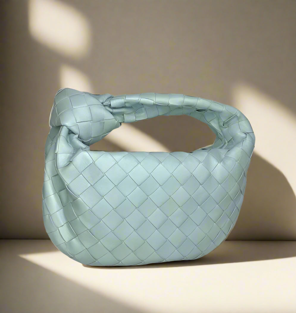 BOTTEGA VENETA Nappa Intrecciato Mini BV Jodie in Teal Washed. This stylish handbag is beautifully crafted of soft woven lambskin leather in light blue. The bag features a matching handle and a gold top zipper that opens to a compact blue leather interior.