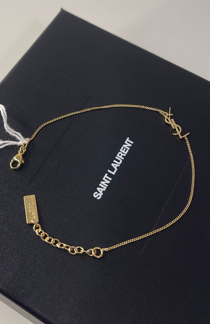 Adjustable bracelet with horizontal interlocking YSL charm at center.